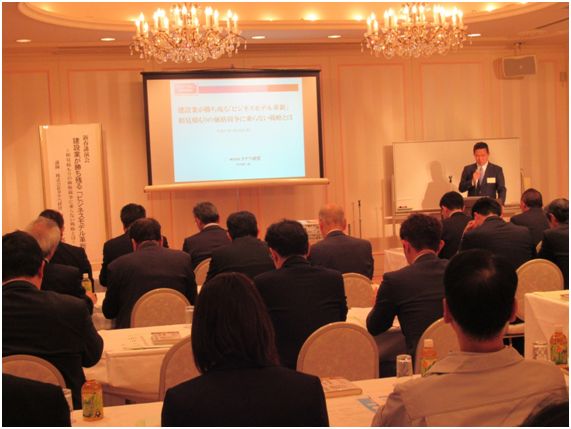 | また来賓として出席された村本建設㈱村本社長は「ものづくりへの情熱と働き方改革の両立は大変難しいと思うが、組合の皆さんからの提案を積極的に取り入れて双方同時に達成したい。」と述べられました。 講演会ではタナベ経営の竹内建一郎コンサルティング戦略本部副本部長が、「建設業が勝ち残る『ビジネスモデル革新』」と題して「相見積もりの価格競争に乗らない戦略」について講演をしました。 |